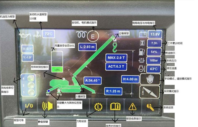 | 傾翻報(bào)警 | 吊重狀態(tài)車體傾斜超過3度,系統(tǒng)自動(dòng)切斷油路,防止翻車;行走狀態(tài)車體傾斜超過20度時(shí),系統(tǒng)報(bào)警提示。 | 復(fù)位狀態(tài)失效